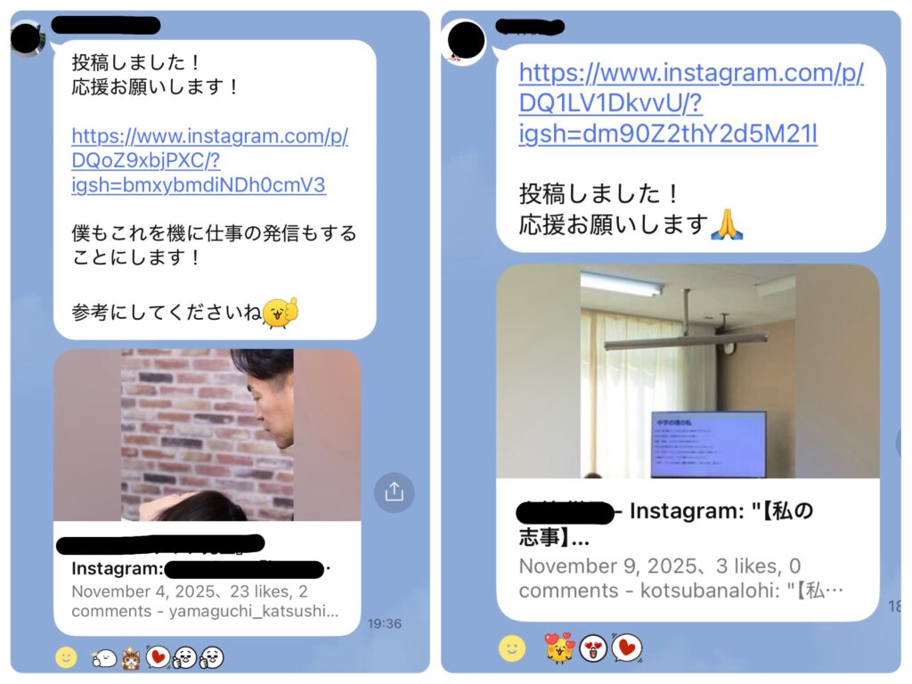 3. 相互応援の実施:参加メンバーは投稿を確認し、「いいね!」やコメント(例:「勉強になりました!」「これは真似したいです!」など)で応援します。