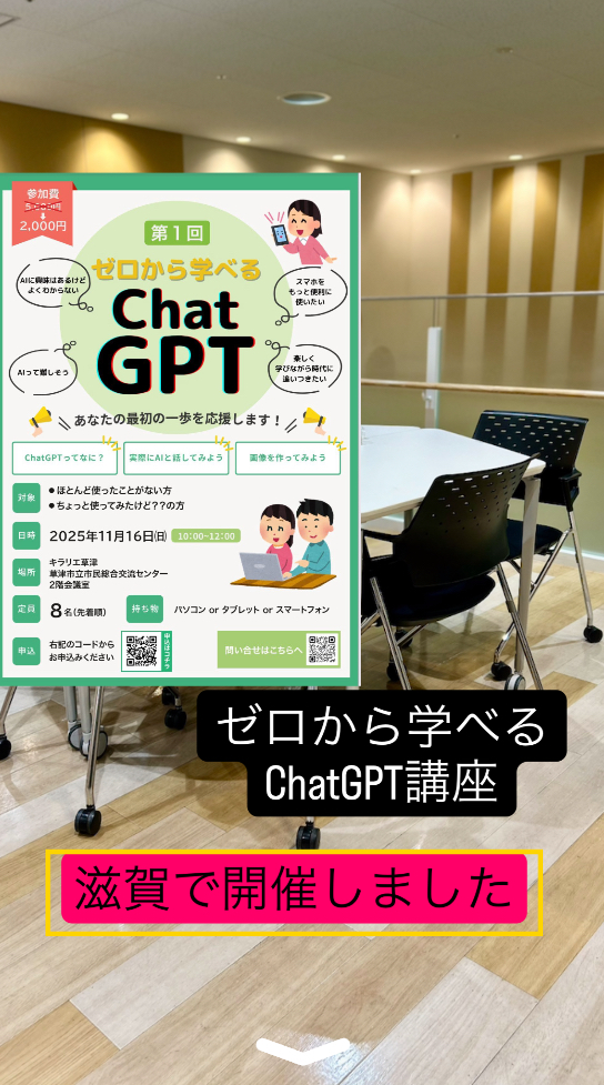 - 【魅力3】「作りたい」が形になるリアル講座(草津市開催)オンラインでは伝わりにくい、操作のちょっとしたコツや質問にもその場でお答えします。講師があなたのPC画面を見ながら丁寧にサポートするので、置いていかれる心配はありません。