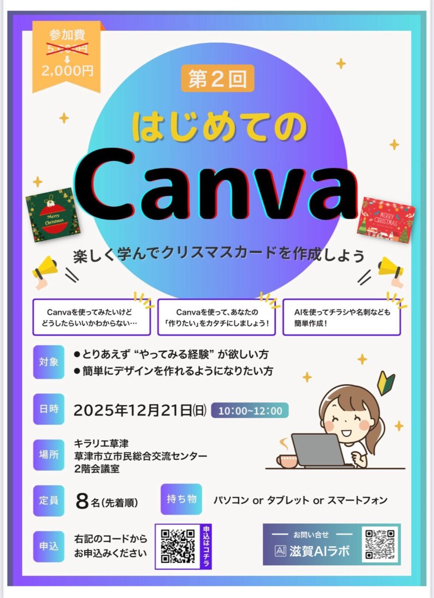 対象 Canvaを初めて使う方、簡単なデザインスキルを身につけたい方 日時 2025年12月21日(日) 10:00〜12:00 (クリスマス直前の日曜日!) 場所 キラリエ草津・草津市立市民総合交流センター 2階会議室